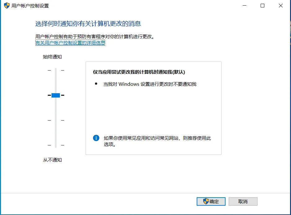 所以,如果你很少看到上面这种弹窗,请检查下面的设置。如果发现控制条已经被拉到最底部,说明要么你中毒或中木马了,要么就是你信任无比的杀毒软件干了这件事情。