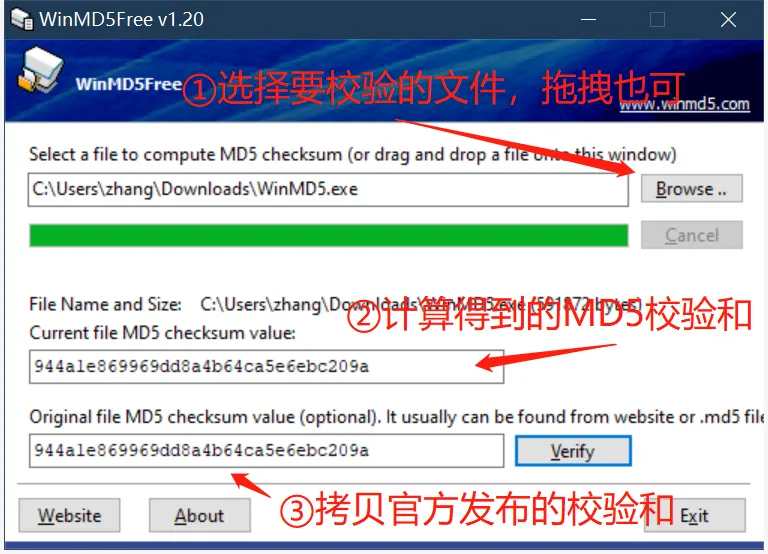 - 拷贝官方公布的文件的MD5值,点击Verify进行验证。