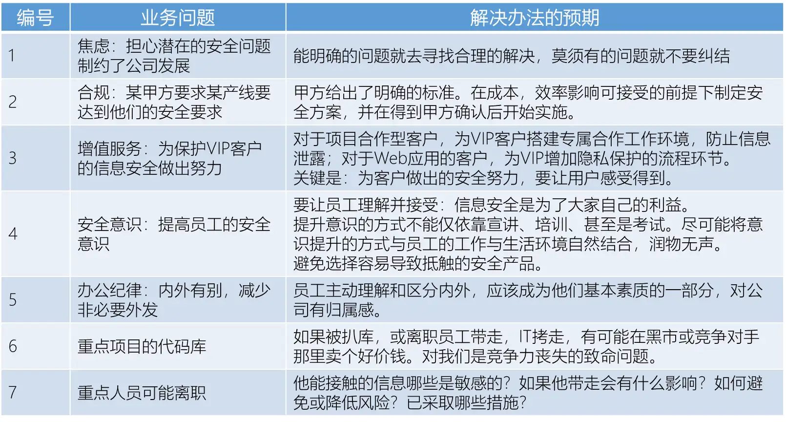 一份如上面示例的业务问题清单可以是一个公司信息安全管理工作的起点,为后面的工作提供了要求、方向和评价标准。