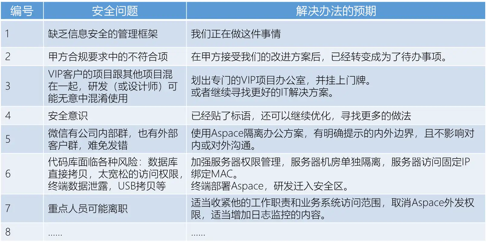安全问题清单可能会很长,也可能会比较凌乱。尤其是在缺乏安全经验的情况下,解决办法部分可能会缺乏条理,甚至包含错误。这些都没关系,最重要的是写出来。在后面的使用过程中,可以咨询专家、借助供应商的帮助来逐步完善。